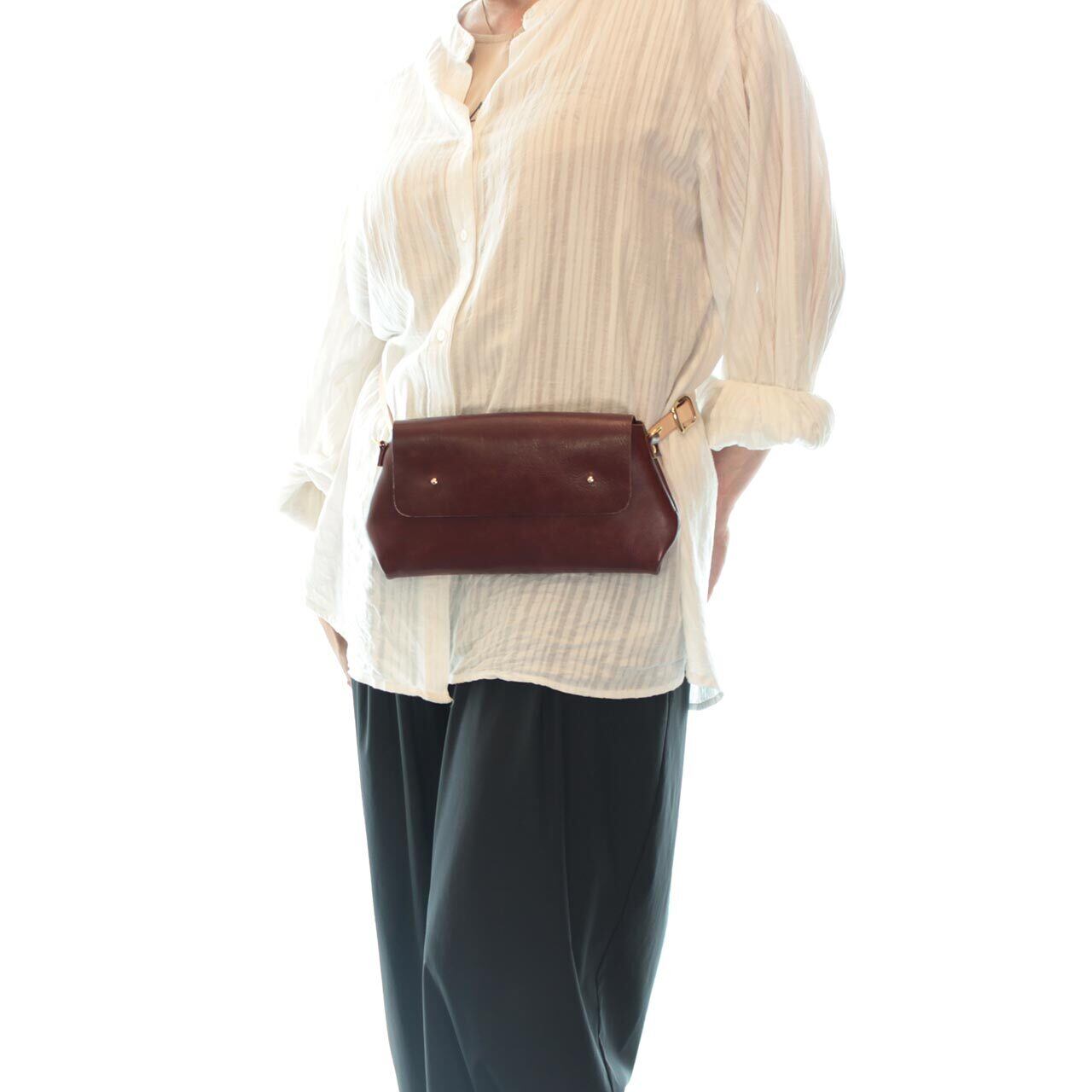 背面の手持ち部分はベルト通しにもなっており、お手持ちのベルトを通してウエストポーチとして使うこともできます。また、手持ち部分と両サイドにはDカンがあり、ストラップを掛けて斜めがけショルダーにも。